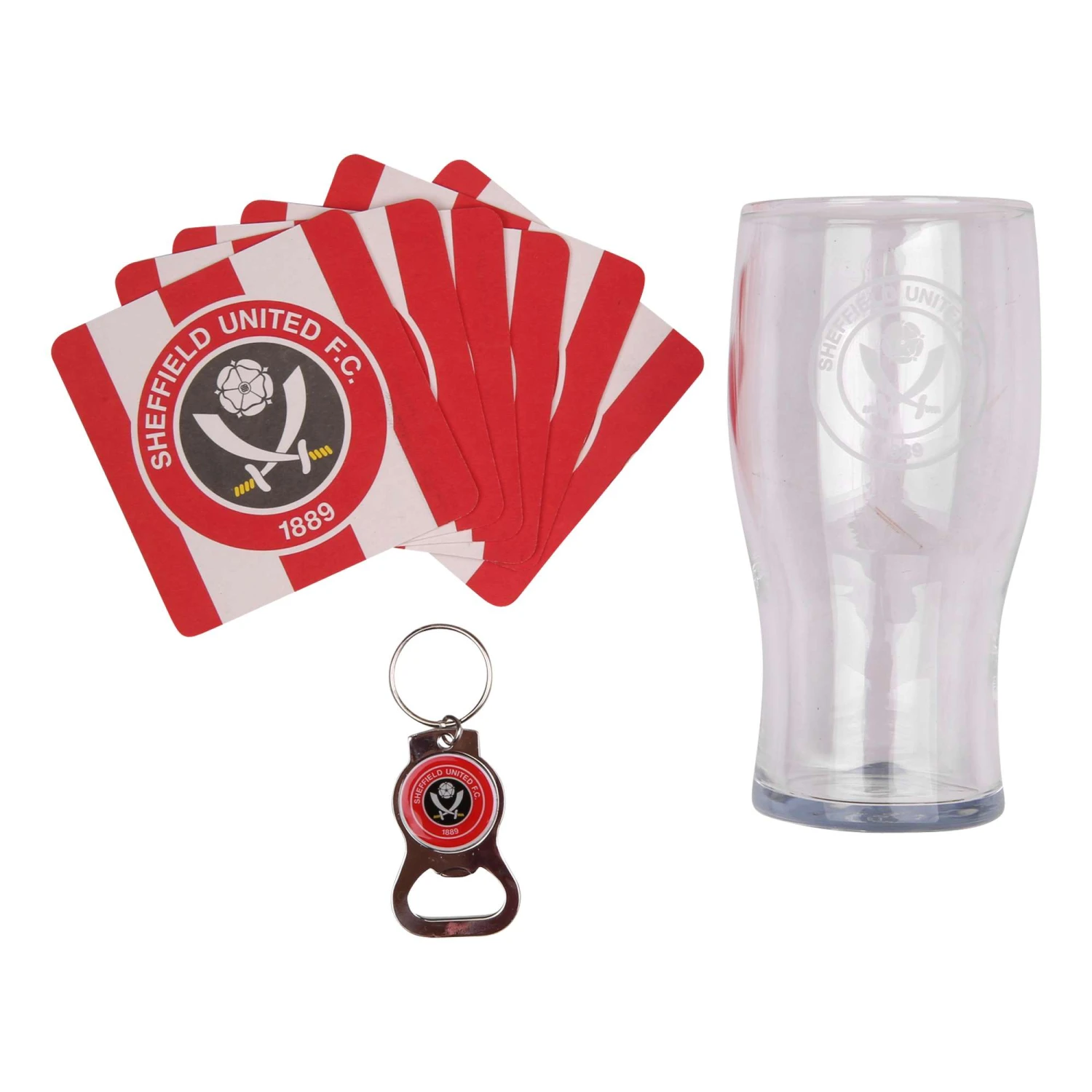 SUFC pint class, cardboard drink coasters and bottle opener.