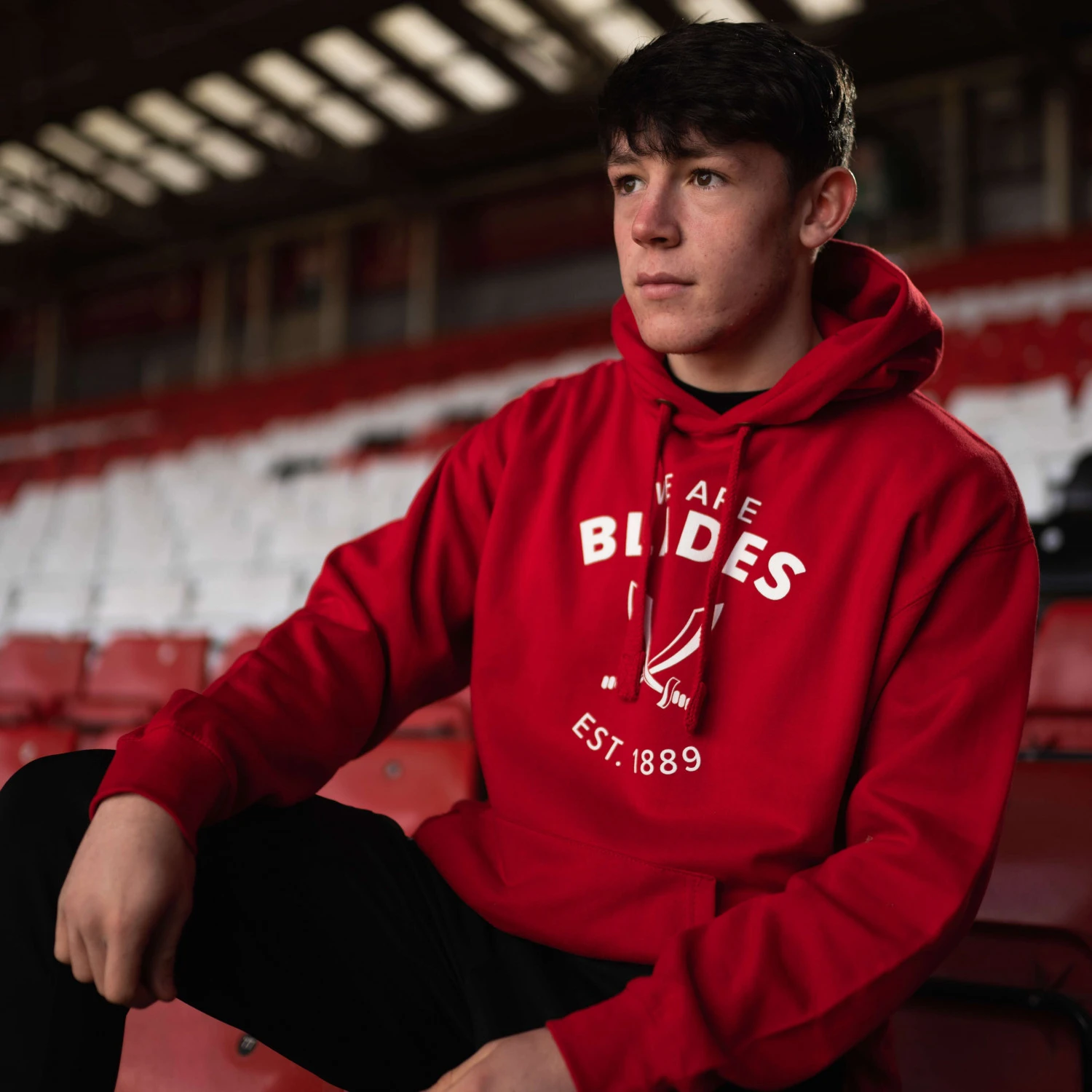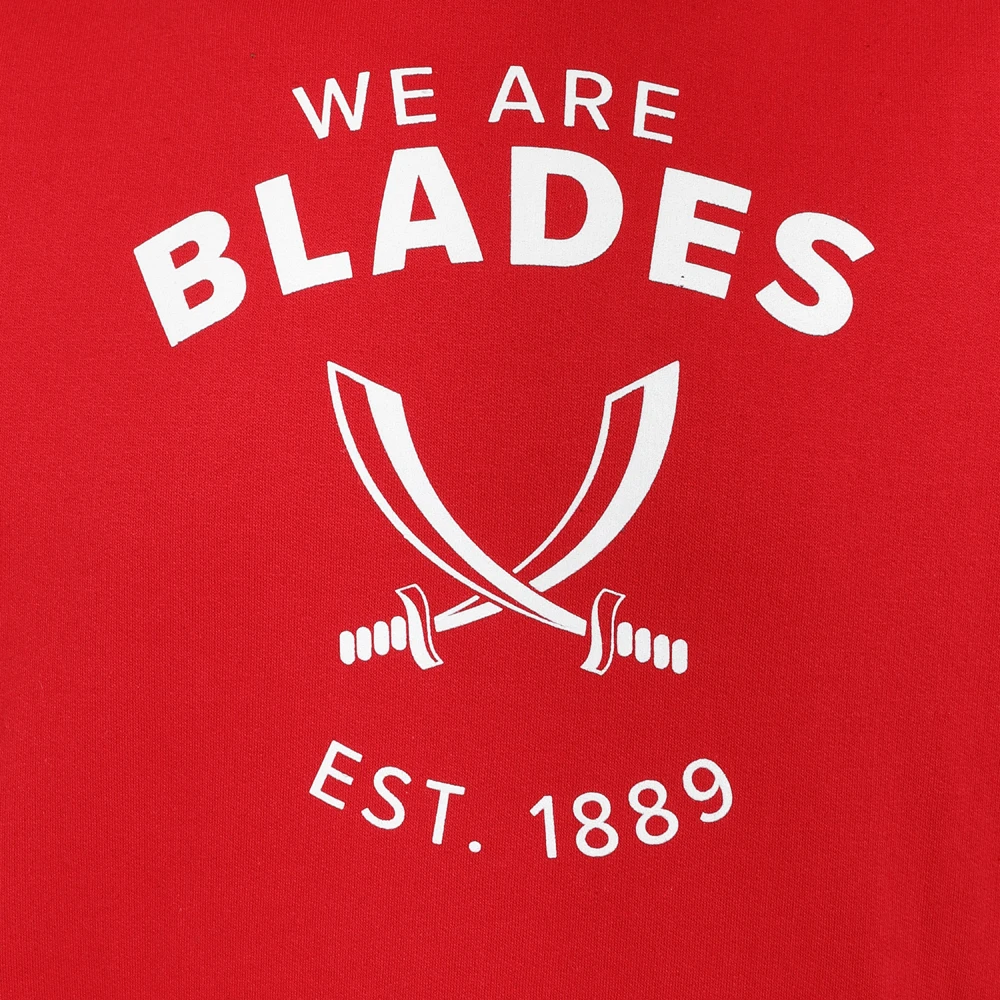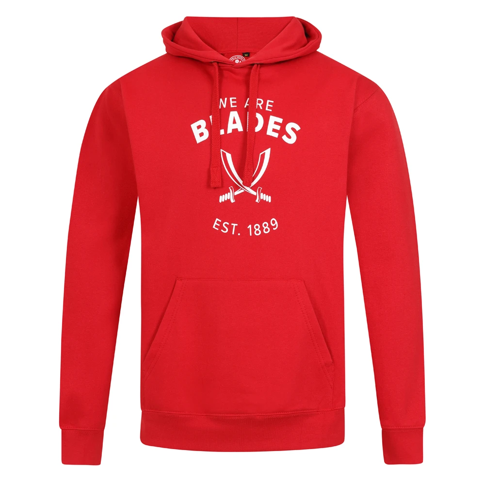 - Blades sword hoody in red featuring ‘We Are Blades’ text with sword image and ‘Est 1889’ white text.