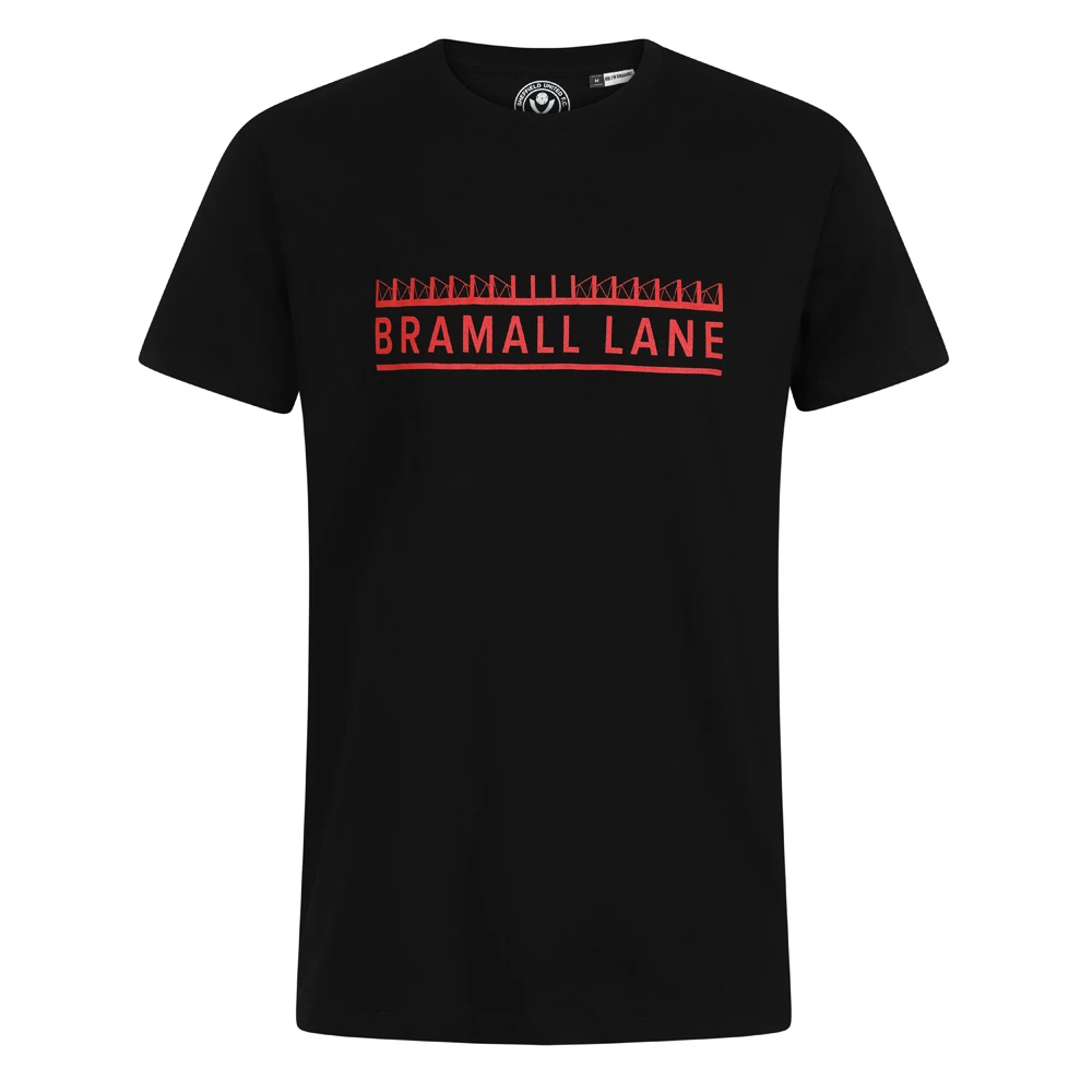 - Bramall lane black tee featuring red ‘Bramall Lane’ text and stadium graphic.