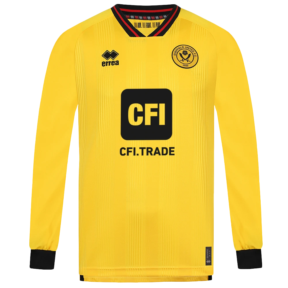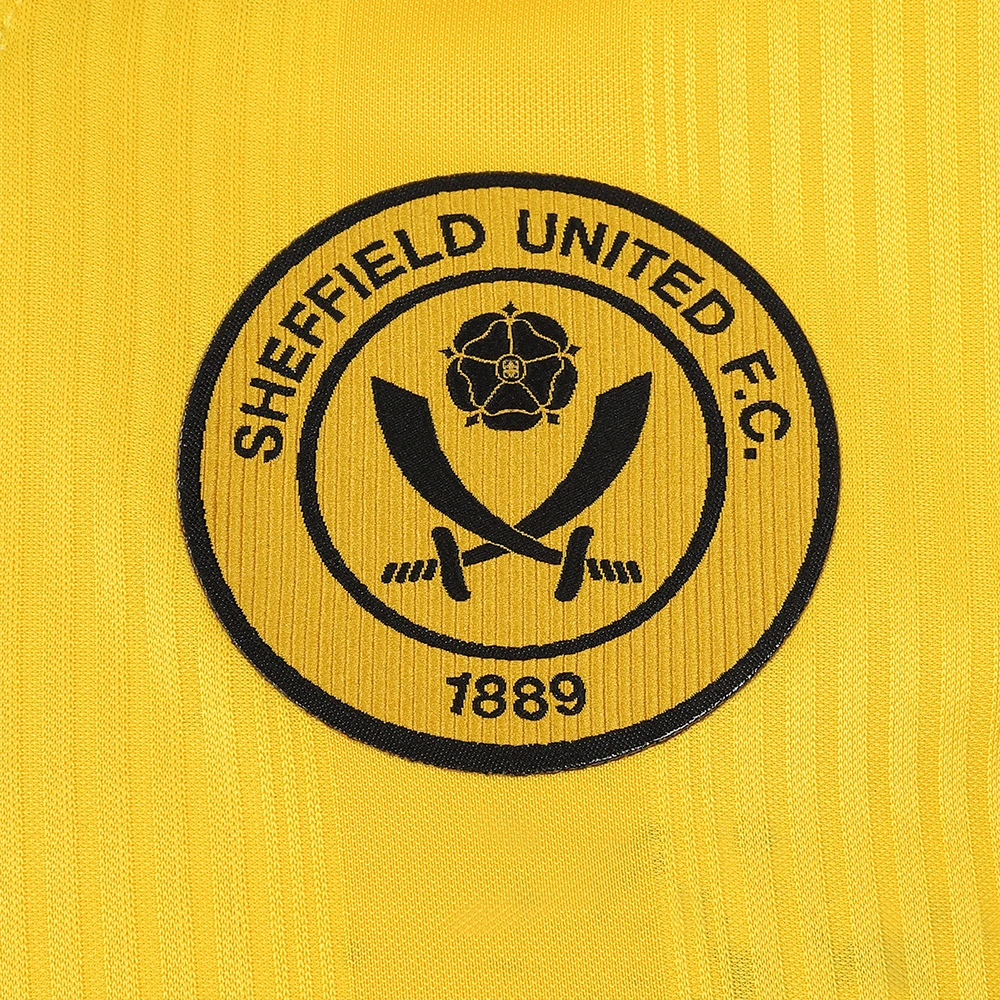 This season’s Errea away shirt brings back a colour associated with United away kits throughout the 80s and early 90s, an era where United rose from division four to top flight of English football. The yellow strip is made from a jacquard fabric with thin stripes woven into the material, it’s complimented by black and red elasticated ribbed collar and cuffs alongside yellow shorts with black trim and yellow socks with black and red trim. The alternative socks and shorts options for this kit are red while the black home options will also allow for a number of different kit combinations should the Bladesmen require.