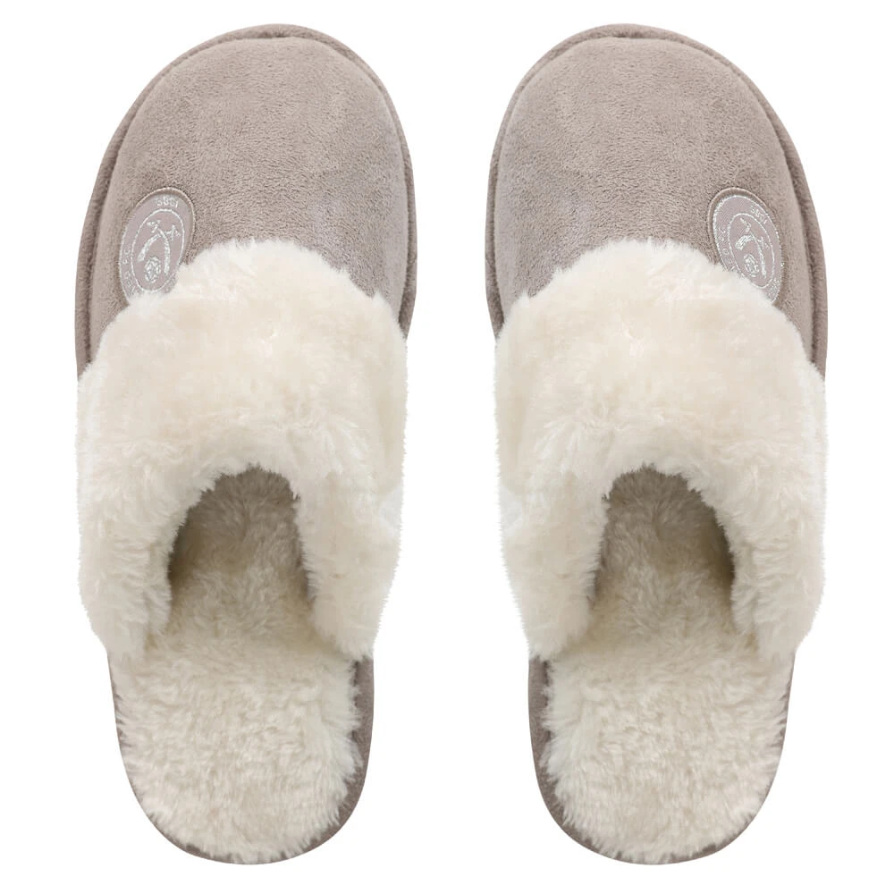 - SUFC grey and cream ladies mule slippers. Crest logo with silver stitching.