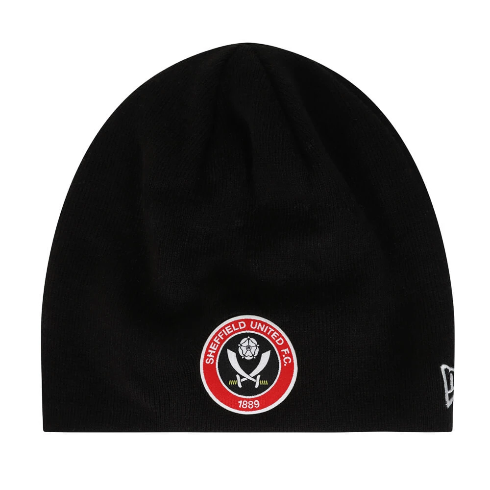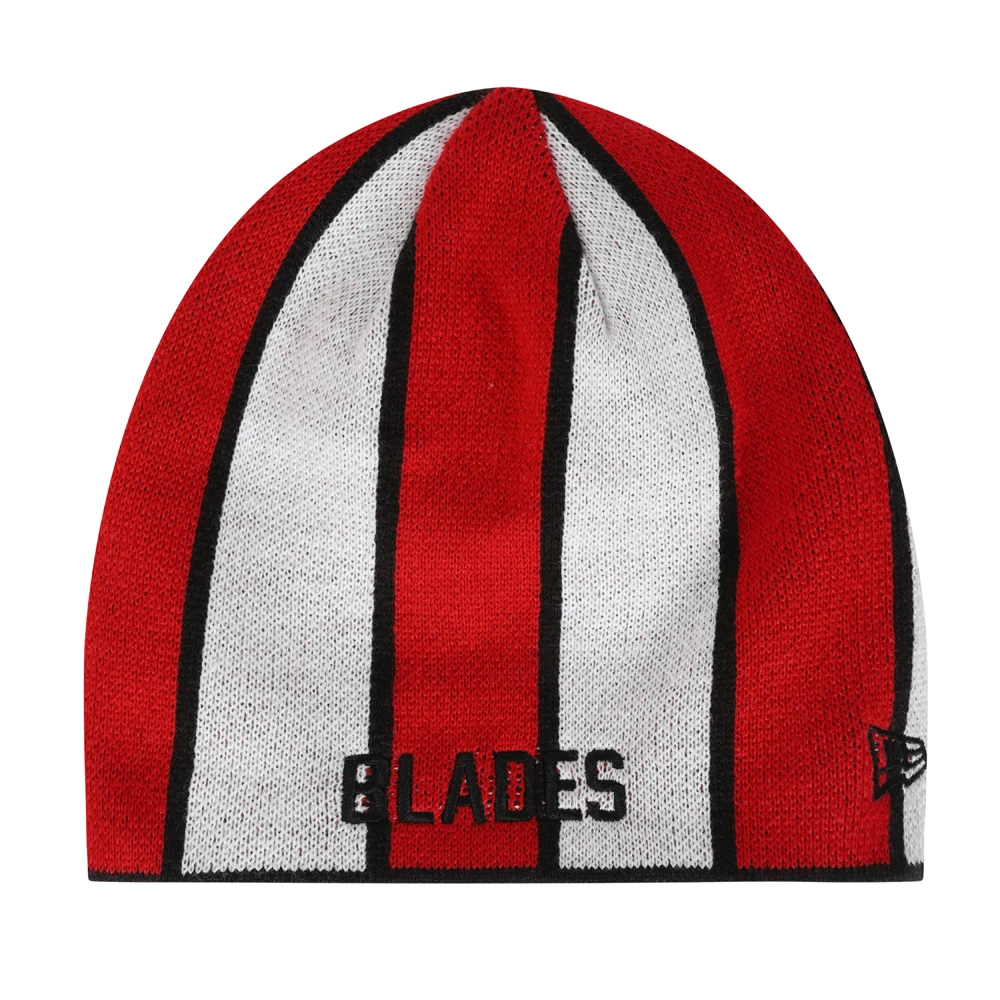 This is our skull knit reversible beanie, just one of our beanie designs. This straight beanie style is black with the SUFC crest and white embroidered New Era logo. And on the reverse is a red, white and black strip design with Blades embroidered in black bold stitching, next to the New Era logo.Â