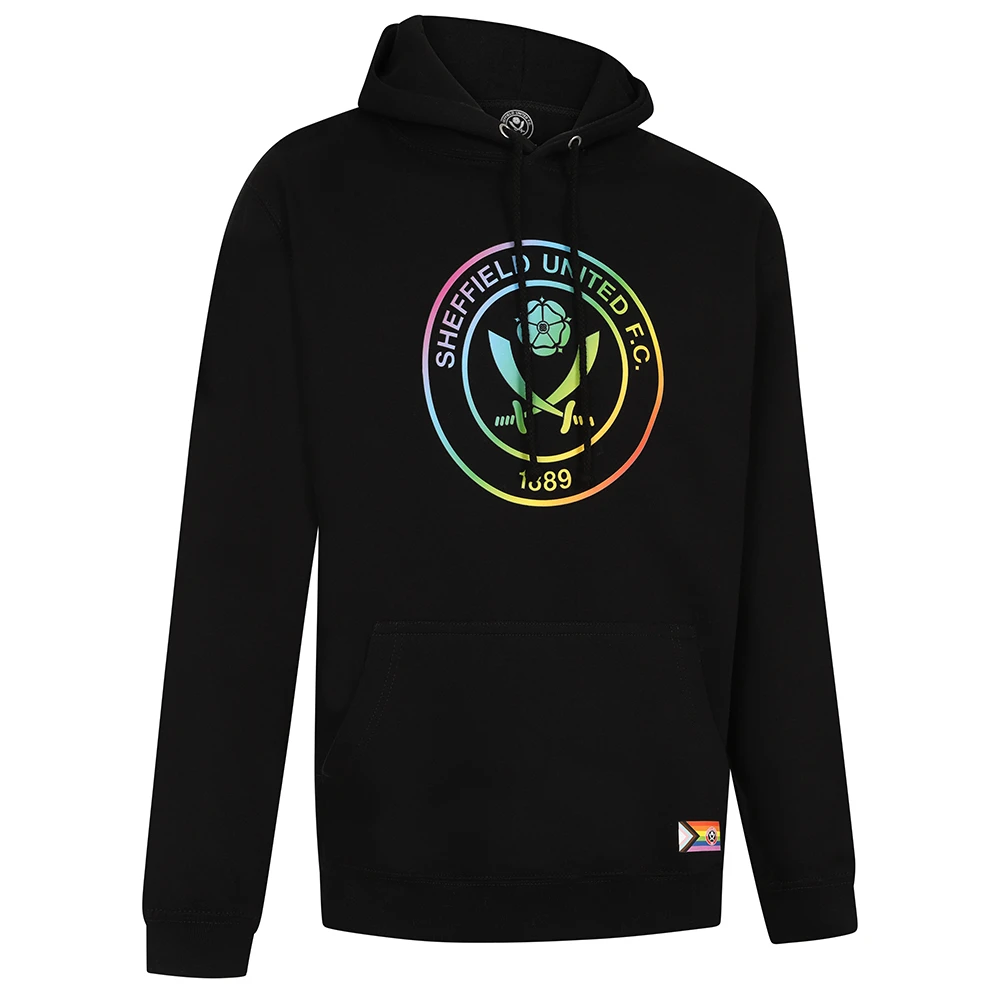- Rainbow hoody in black featuring rainbow crest and progress flag hem detail.