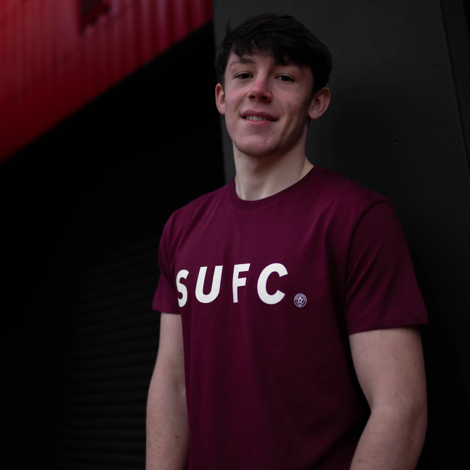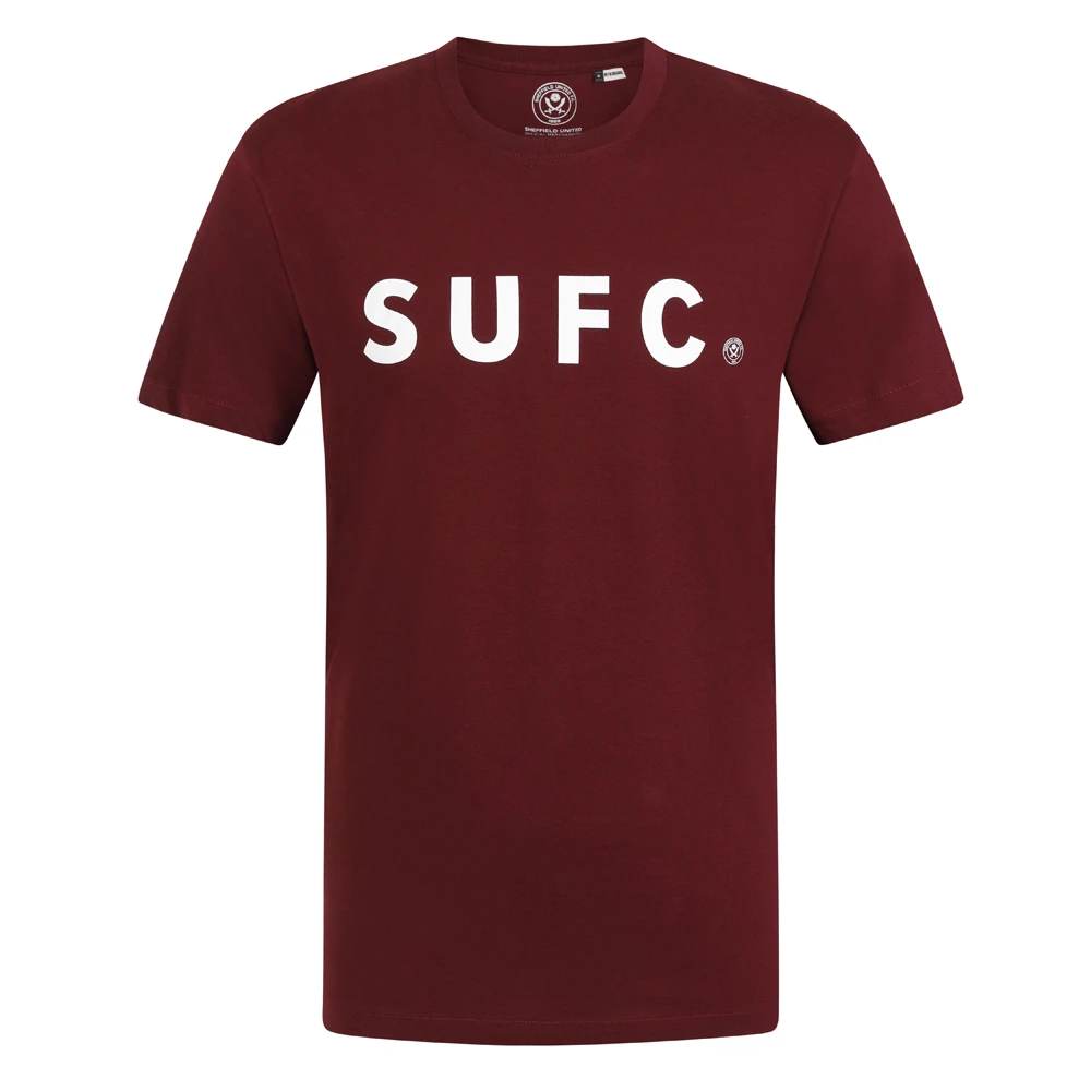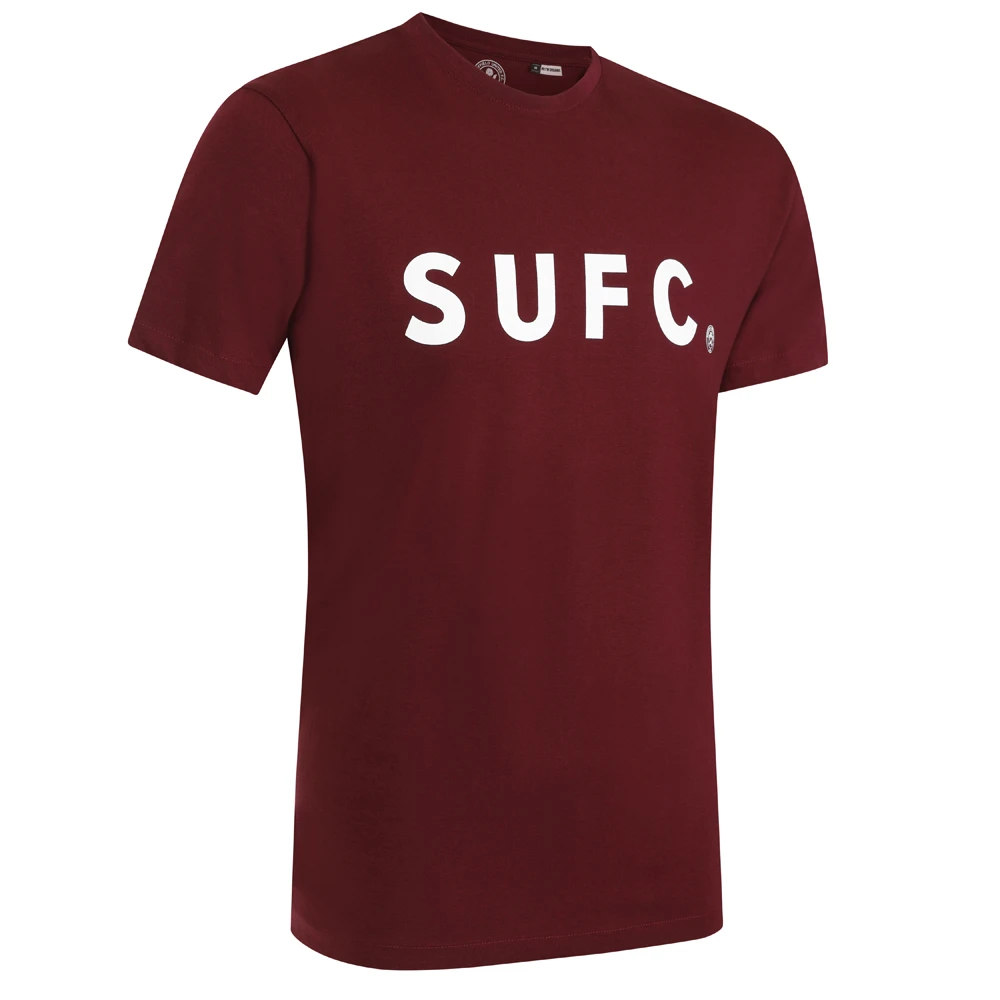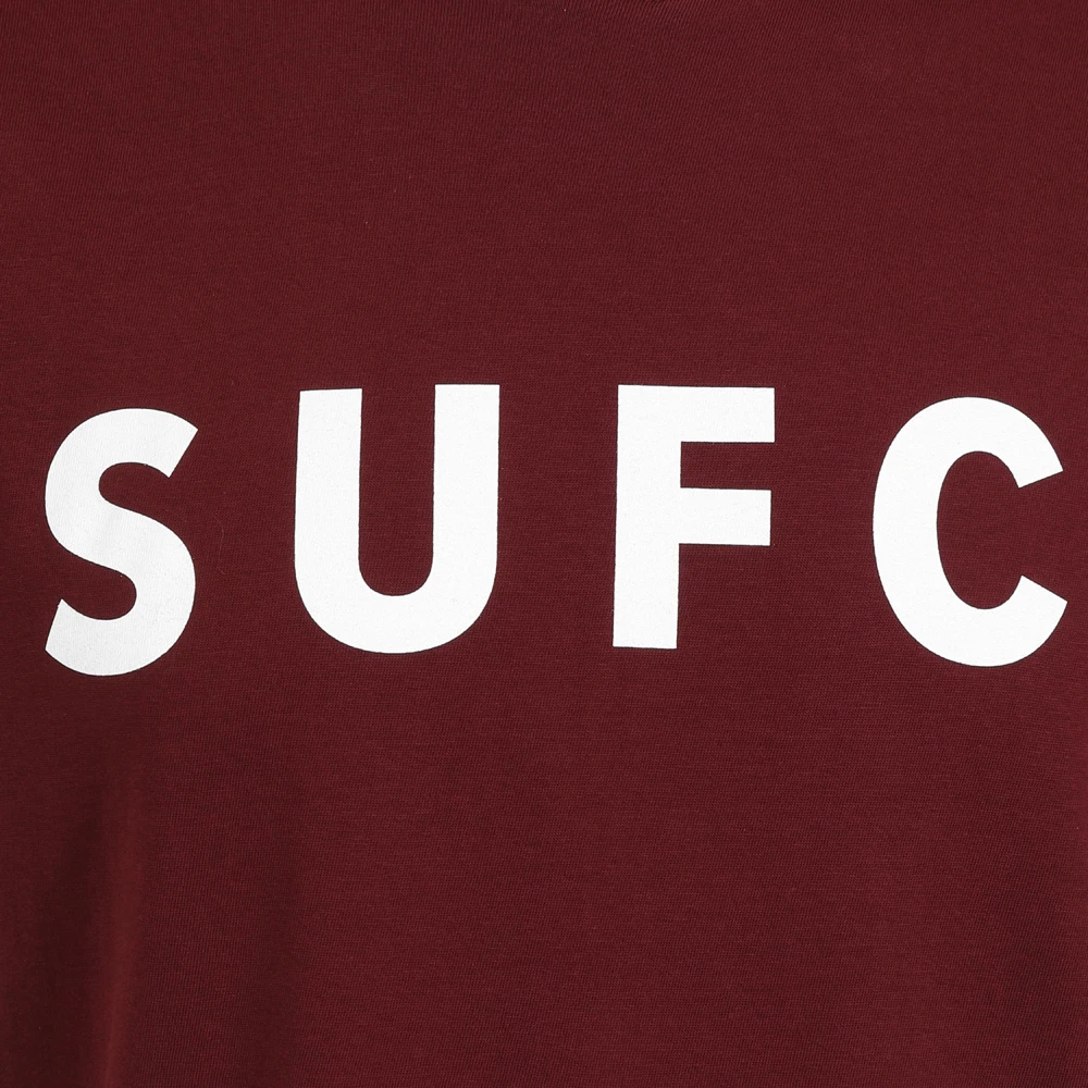 - Dark red tee with white ‘SUFC’ text and small SUFC crest in white