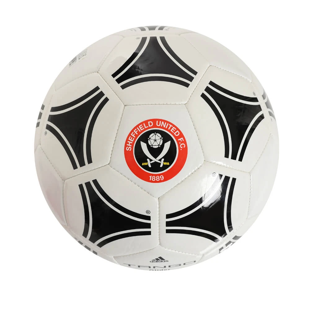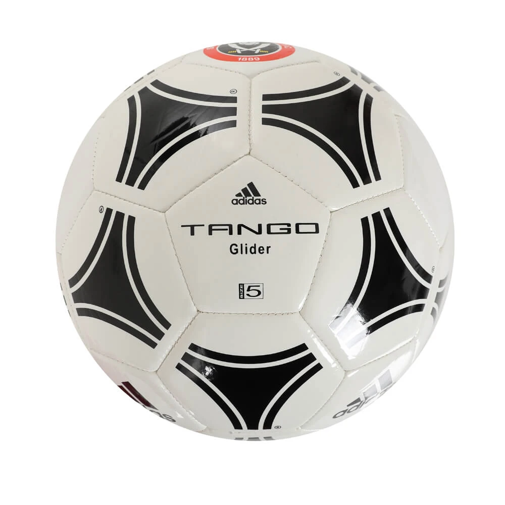 White and black Adidas tango glider football with SUFC crest logo. Made with durable machine stitching for a soft touch, its butyl bladder helps shape and air retention, match after match. Size 5.