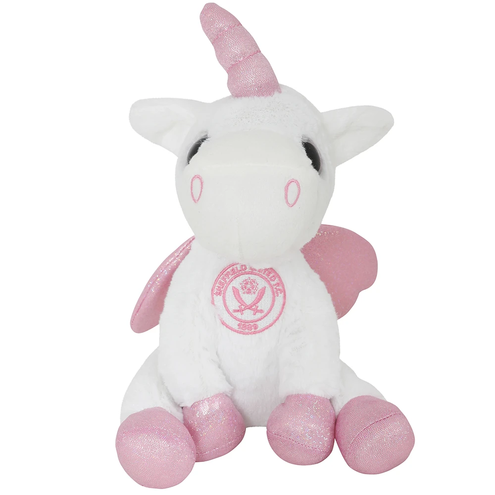 SUFC pink & white unicorn toy. Pink SUFC crest logo on chest.